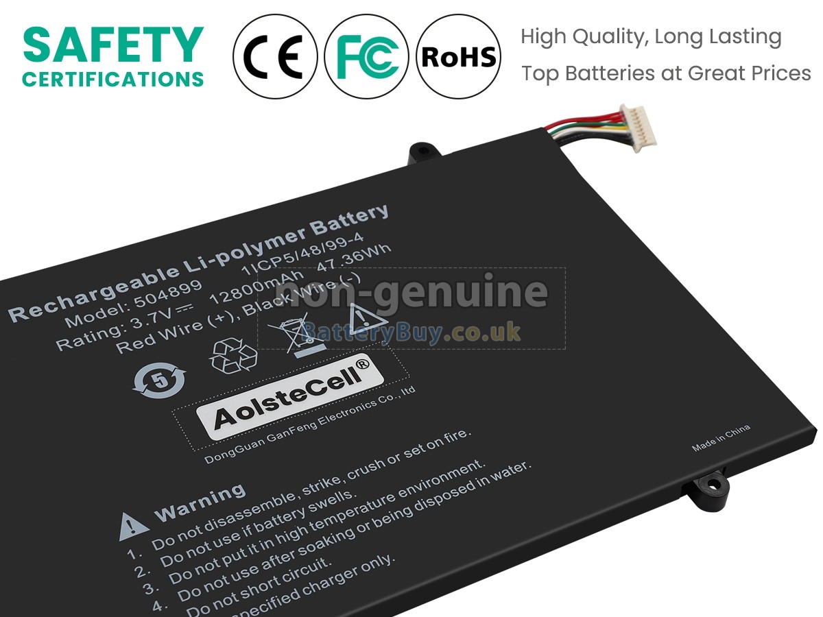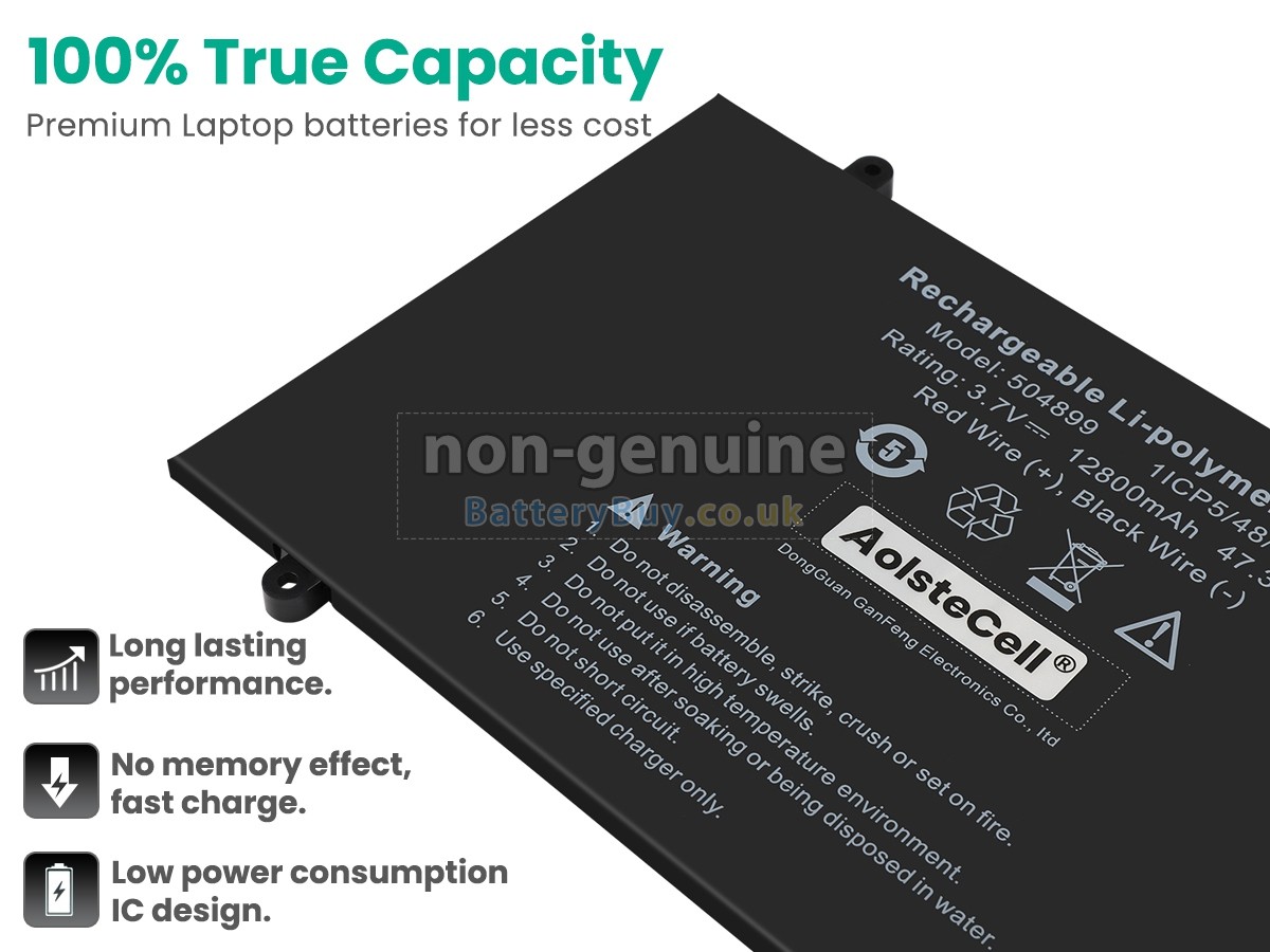 BatteryBuy.co.uk is your best choice of high quality AolsteCell laptop batteries! The brand new 47.36Wh(4 cells) replacement AolsteCell 504899 Li-Polymer battery is made with superior quality cells from Samsung, Panasonic and LG to ensure the best performance. AolsteCell 504899 battery case is made of non-flammable and durable plastic, which is fire-retarded and non-perishable when dropped from low heights.