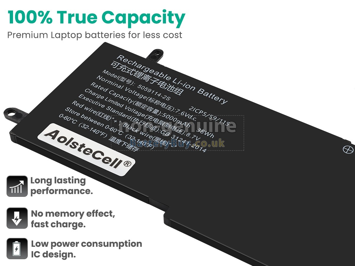 BatteryBuy.co.uk is your best choice of high quality AolsteCell laptop batteries! The brand new 38Wh(2 cells) replacement AolsteCell 5059114-2S Li-Polymer battery is made with superior quality cells from Samsung, Panasonic and LG to ensure the best performance. AolsteCell 5059114-2S battery case is made of non-flammable and durable plastic, which is fire-retarded and non-perishable when dropped from low heights.