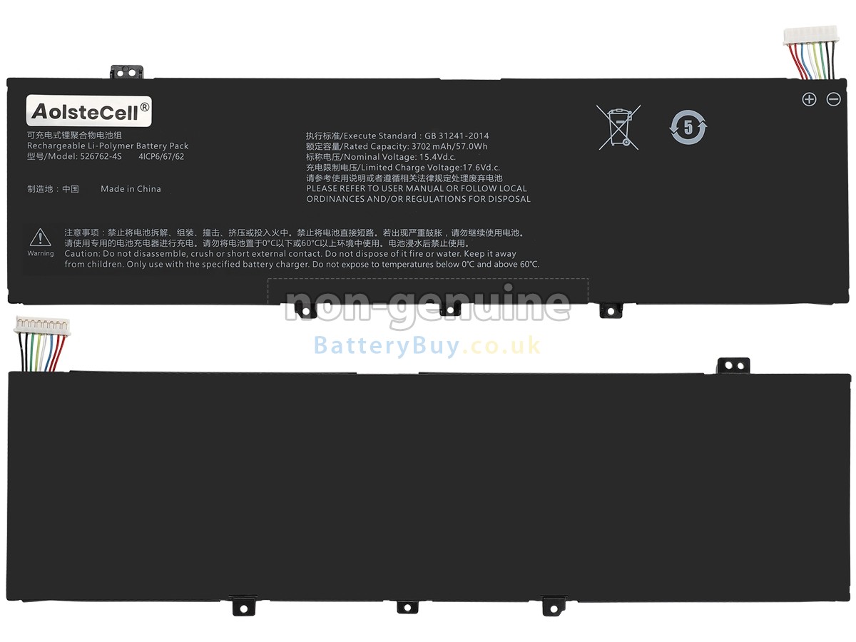 BatteryBuy.co.uk is your best choice of high quality AolsteCell laptop batteries! The brand new 57Wh(4 cells) replacement AolsteCell 526762-4S Li-Polymer battery is made with superior quality cells from Samsung, Panasonic and LG to ensure the best performance. AolsteCell 526762-4S battery case is made of non-flammable and durable plastic, which is fire-retarded and non-perishable when dropped from low heights.