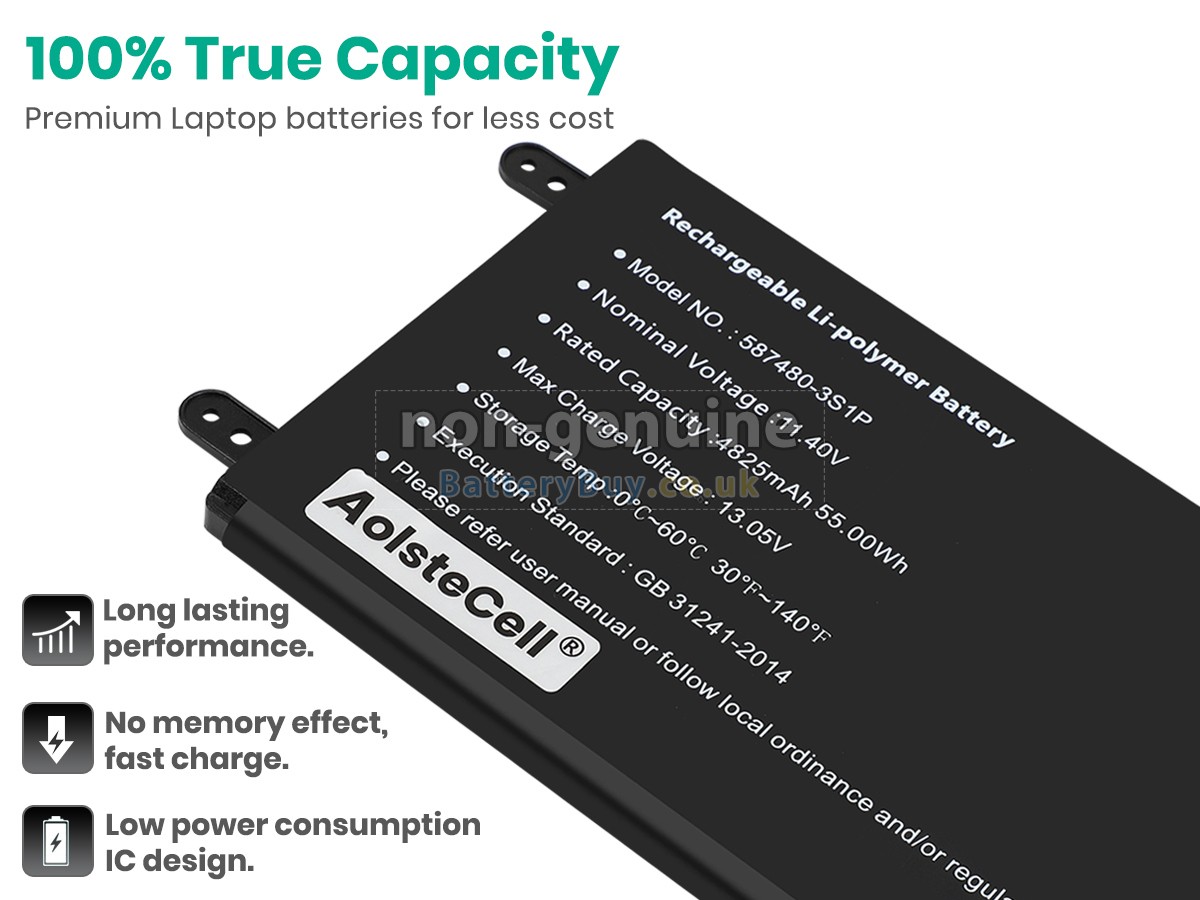 BatteryBuy.co.uk is your best choice of high quality AolsteCell laptop batteries! The brand new 55Wh(3 cells) replacement AolsteCell 587480-3S1P Li-Polymer battery is made with superior quality cells from Samsung, Panasonic and LG to ensure the best performance. AolsteCell 587480-3S1P battery case is made of non-flammable and durable plastic, which is fire-retarded and non-perishable when dropped from low heights.