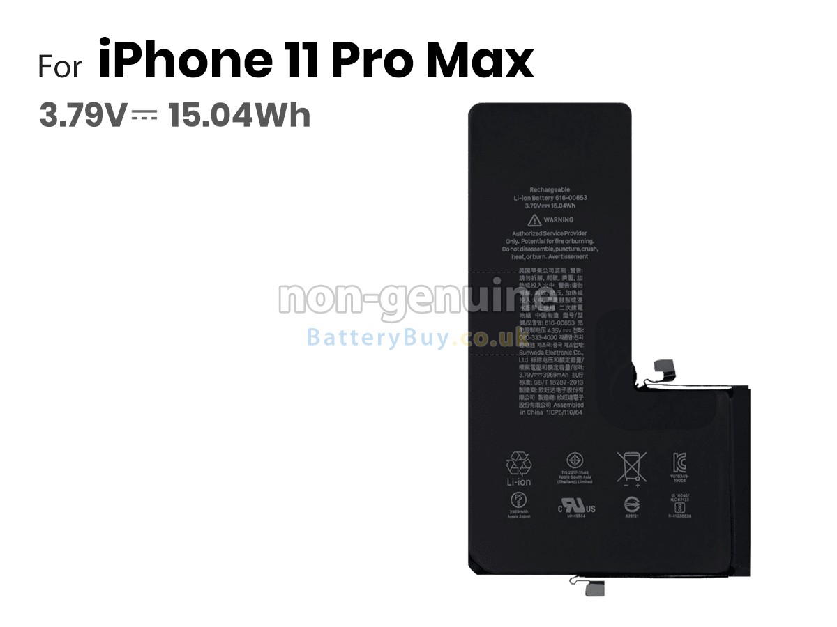 BatteryBuy.co.uk is your best choice of high quality Apple batteries! The brand new 15.04Wh(1 cells) replacement Apple IPHONE 11 PRO MAX Li-Polymer battery is made with superior quality cells from Samsung, Panasonic and LG to ensure the best performance. Apple IPHONE 11 PRO MAX battery case is made of non-flammable and durable plastic, which is fire-retarded and non-perishable when dropped from low heights.