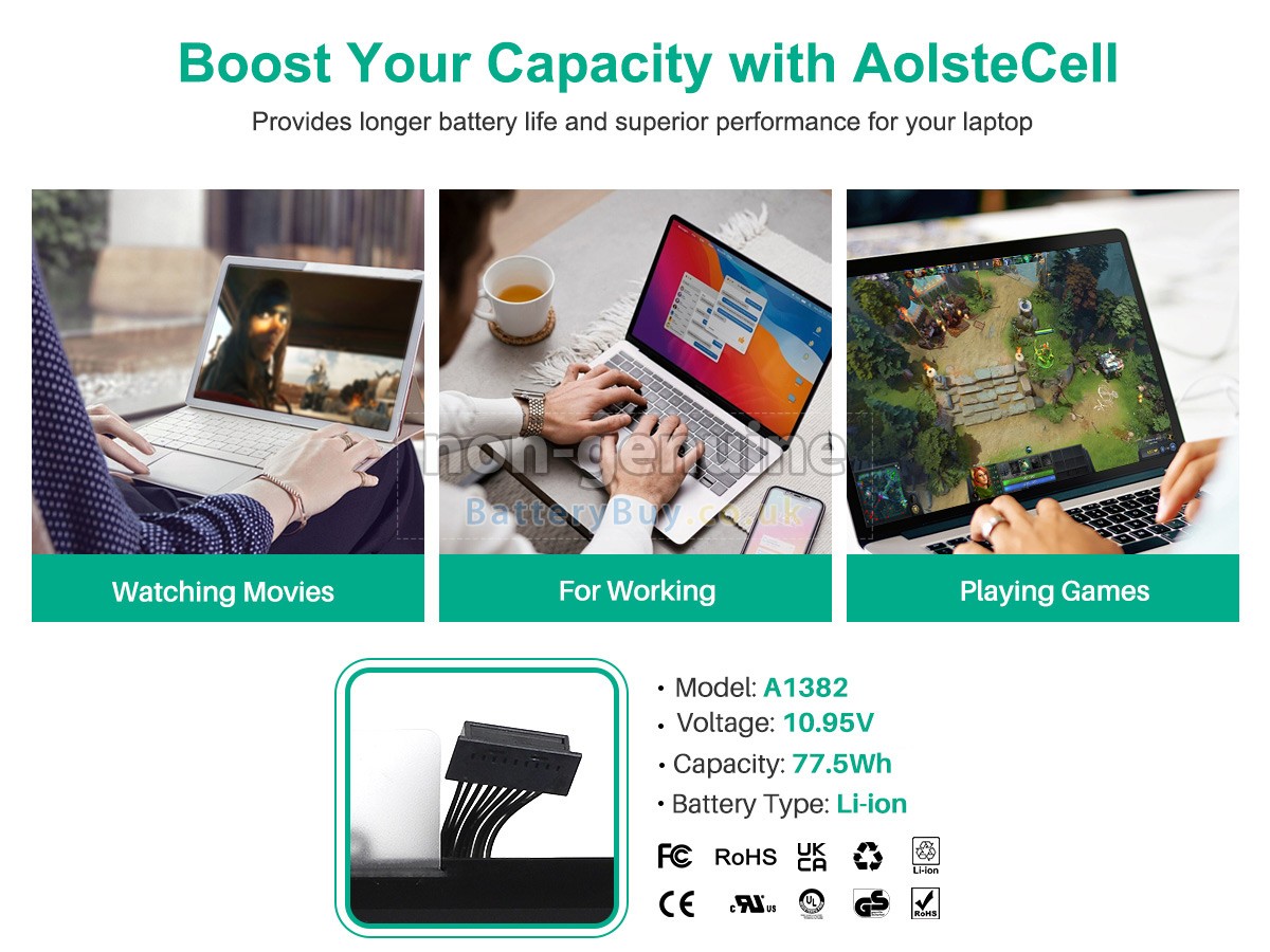 BatteryBuy.co.uk is your best choice of high quality Apple laptop batteries! The brand new 77.5Wh(9 cells) replacement Apple MacBook Pro 15.4 inch I7 Unibody A1286 (2011 Version) Li-Polymer battery is made with superior quality cells from Samsung, Panasonic and LG to ensure the best performance. Apple MacBook Pro 15.4 inch I7 Unibody A1286 (2011 Version) battery case is made of non-flammable and durable plastic, which is fire-retarded and non-perishable when dropped from low heights.