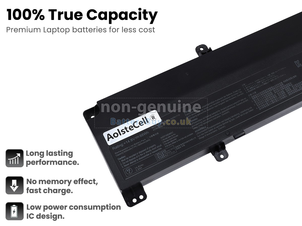 BatteryBuy.co.uk is your best choice of high quality Asus laptop batteries! The brand new 88Wh(4 cells) replacement Asus Rog STRIX GL702VI-BA016T Li-Polymer battery is made with superior quality cells from Samsung, Panasonic and LG to ensure the best performance. Asus Rog STRIX GL702VI-BA016T battery case is made of non-flammable and durable plastic, which is fire-retarded and non-perishable when dropped from low heights.