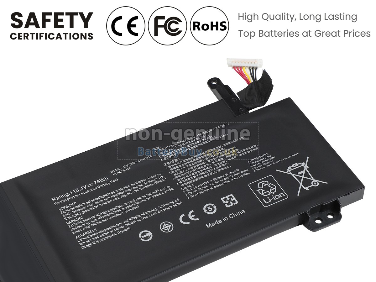 We are very strict with the safety requirements. Every our high-grade replacement battery for Asus Rog STRIX GL703GS-DS74 laptop has been tested to prove that they can match or surpass original Asus battery performance and be 100% compatible with Original Manufacturer Specifications. In compliance with international standards, they have obtained a series of rigorous safety certifications such as CE, UL, ROHS, ISO9001/9002. In general, this replacement Asus Rog STRIX GL703GS-DS74 battery can be charged/discharged up to more than 600 cycles.