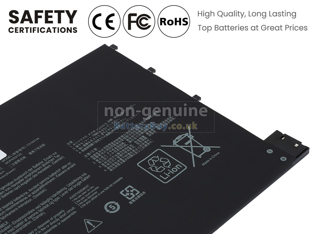 We are very strict with the safety requirements. Every our high-grade replacement battery for Asus VivoBook 13 SLATE OLED T3300KA laptop has been tested to prove that they can match or surpass original Asus battery performance and be 100% compatible with Original Manufacturer Specifications. In compliance with international standards, they have obtained a series of rigorous safety certifications such as CE, UL, ROHS, ISO9001/9002. In general, this replacement Asus VivoBook 13 SLATE OLED T3300KA battery can be charged/discharged up to more than 600 cycles.