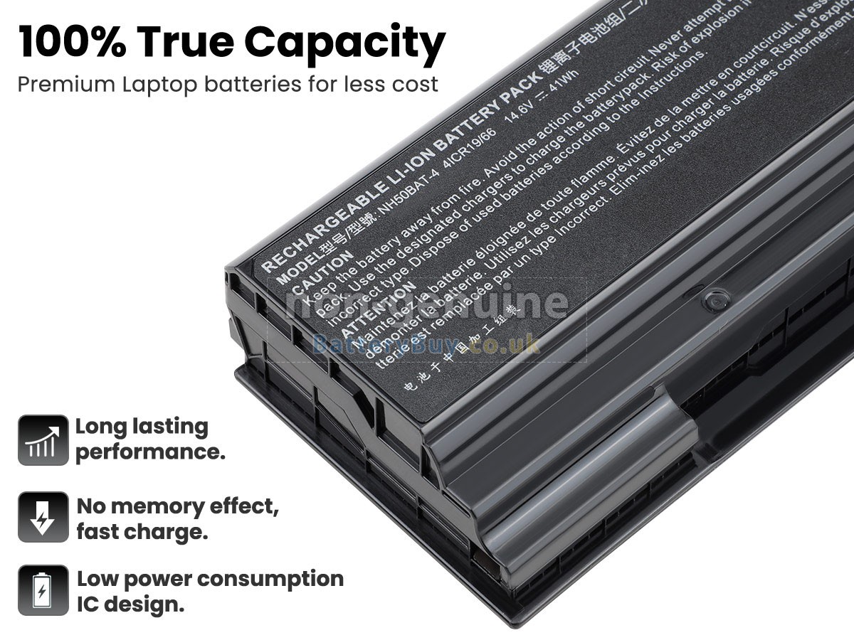 BatteryBuy.co.uk is your best choice of high quality Clevo laptop batteries! The brand new 41Wh(4 cells) replacement Clevo XOTIC G70R NH70RCQ Li-ion battery is made with superior quality cells from Samsung, Panasonic and LG to ensure the best performance. Clevo XOTIC G70R NH70RCQ battery case is made of non-flammable and durable plastic, which is fire-retarded and non-perishable when dropped from low heights.