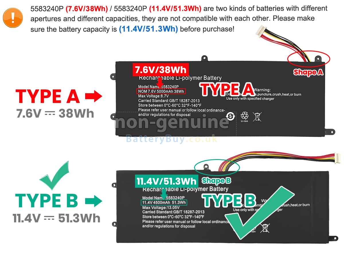 BatteryBuy.co.uk is your best choice of high quality Cooyes laptop batteries! The brand new 38Wh(2 cells) replacement Cooyes 5583240P Li-Polymer battery is made with superior quality cells from Samsung, Panasonic and LG to ensure the best performance. Cooyes 5583240P battery case is made of non-flammable and durable plastic, which is fire-retarded and non-perishable when dropped from low heights.
