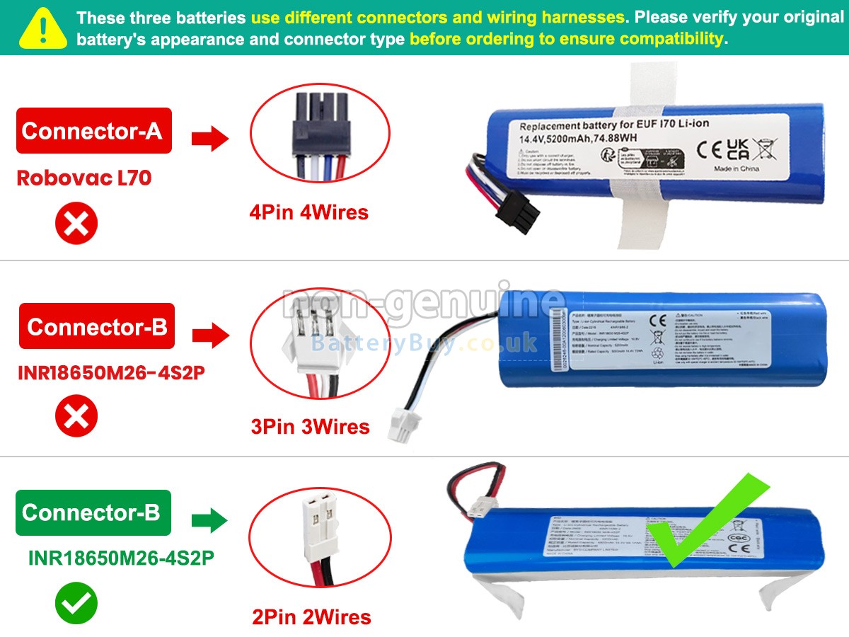 A: First, find out your old battery part number (e.g. 'Eufy INR18650M26-4S2P') or the model name of vacuum cleaner and then match with our product compatibility table. Second, please compare your old battery with our product images to make sure their shapes are the same. Lastly, check the voltage (rating) is the same as the old one. For more details please click How to find one correct battery for my Vacuum Cleaners?