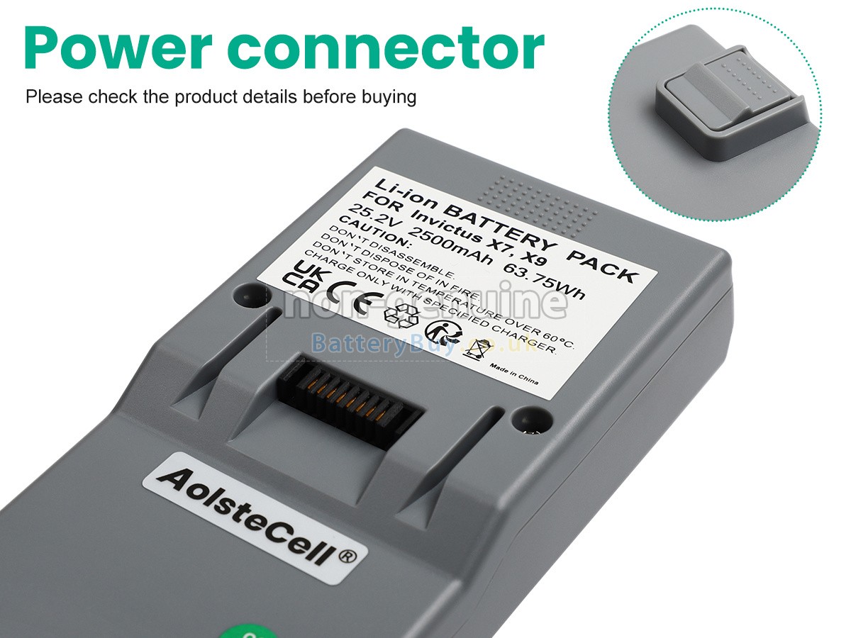 A: First, find out your old battery part number (e.g. 'Genius INVICTUS X9') or the model name of vacuum cleaner and then match with our product compatibility table. Second, please compare your old battery with our product images to make sure their shapes are the same. Lastly, check the voltage (rating) is the same as the old one. For more details please click How to find one correct battery for my Vacuum Cleaners?