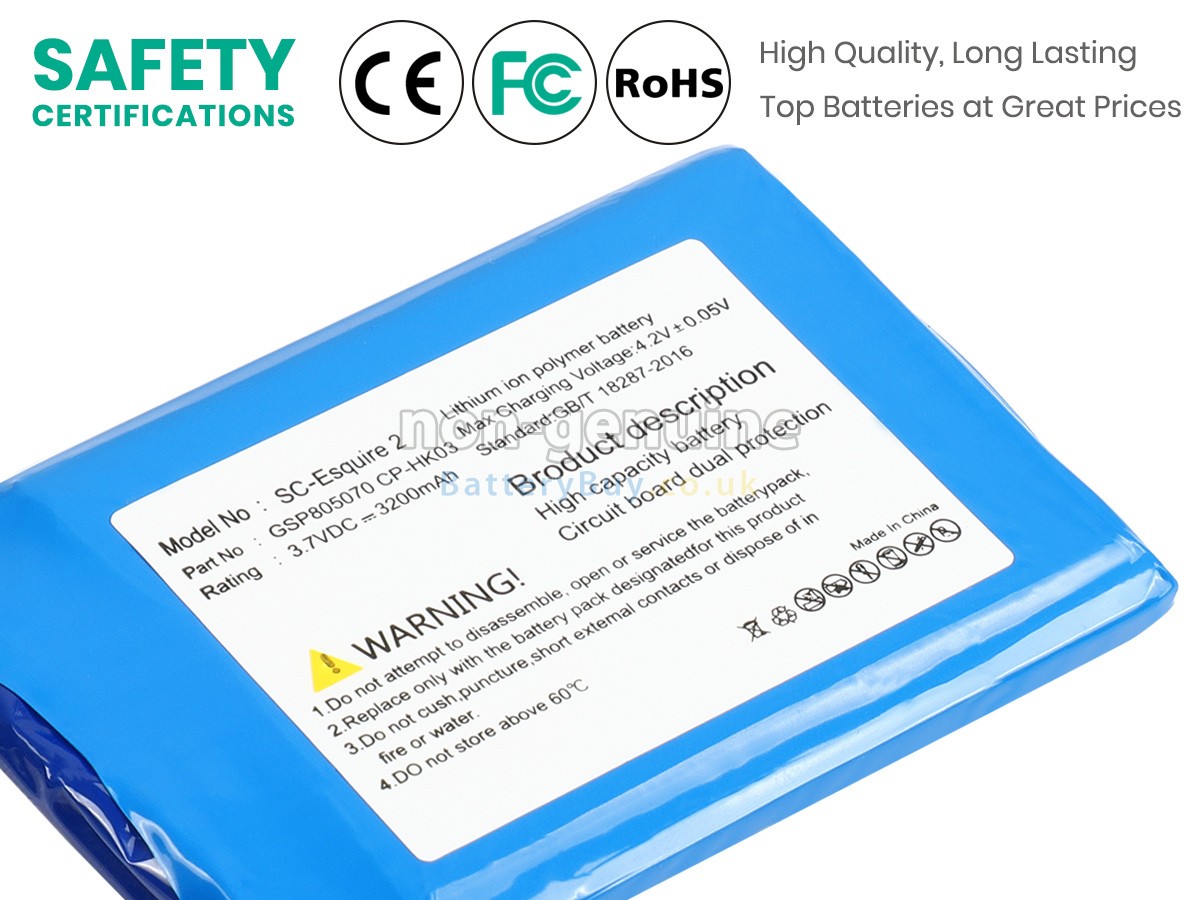 We are very strict with the safety requirements. Every our high-grade replacement battery for Harman Kardon ESQUIRE 2 speaker has been tested to prove that they can match or surpass original Harman Kardon battery performance and be 100% compatible with Original Manufacturer Specifications. In compliance with international standards, they have obtained a series of rigorous safety certifications such as CE, UL, ROHS, ISO9001/9002. In general, this replacement Harman Kardon ESQUIRE 2 battery can be charged/discharged up to more than 600 cycles.