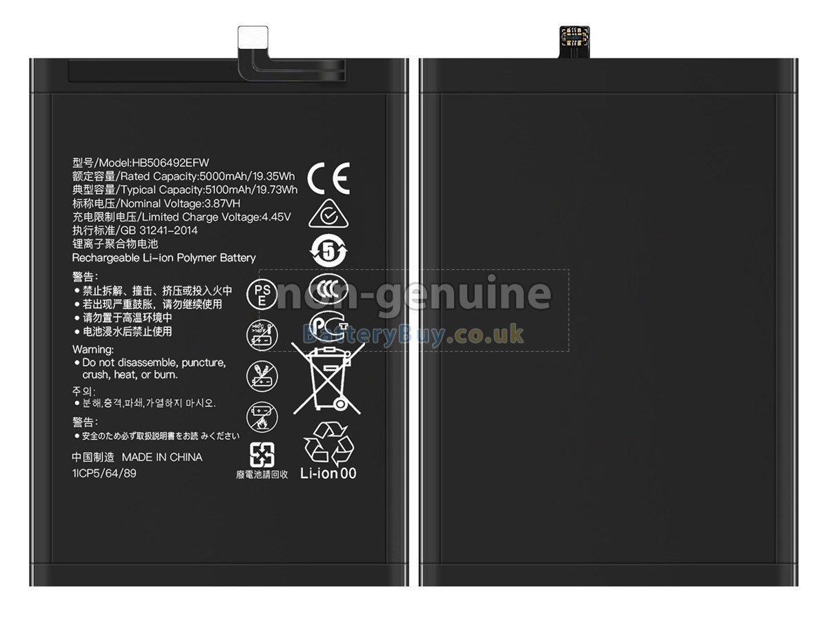 BatteryBuy.co.uk is your best choice of high quality Huawei batteries! The brand new 5100mAh(1 cells) replacement Huawei HONOR X40 RMO-AN00 Li-ion battery is made with superior quality cells from Samsung, Panasonic and LG to ensure the best performance. Huawei HONOR X40 RMO-AN00 battery case is made of non-flammable and durable plastic, which is fire-retarded and non-perishable when dropped from low heights.