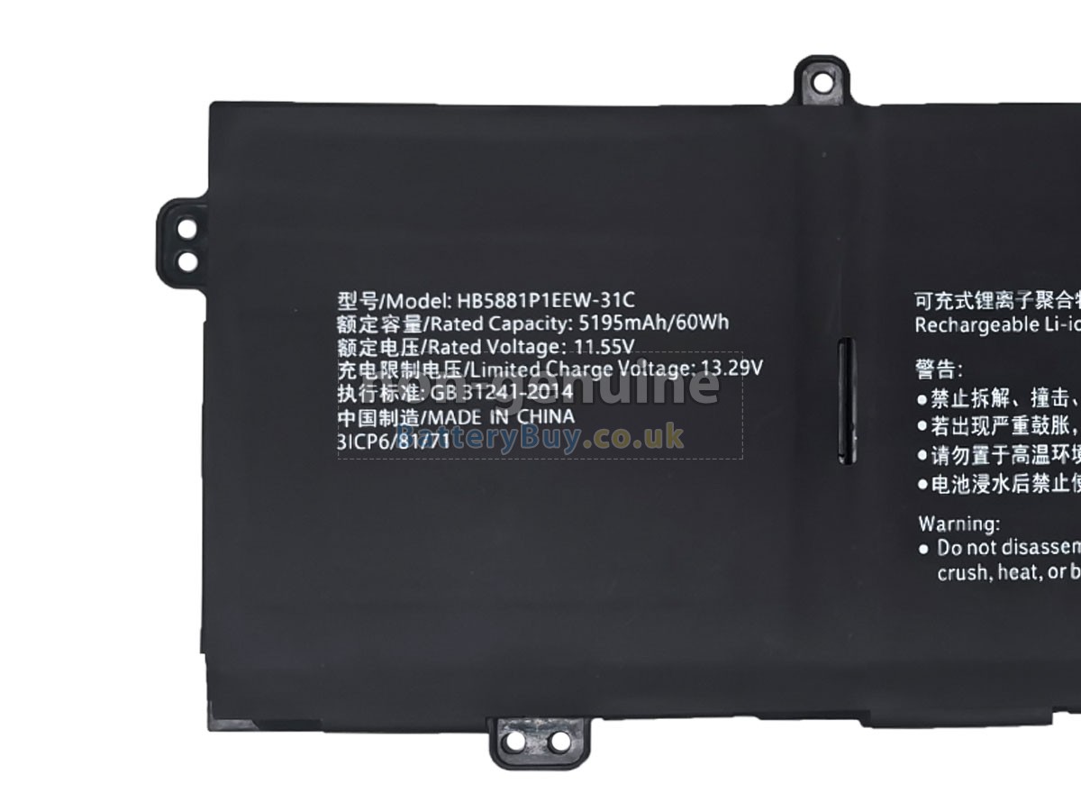BatteryBuy.co.uk is your best choice of high quality Huawei laptop batteries! The brand new 60Wh(3 cells) replacement Huawei MATEBOOK 14S 2022 Li-Polymer battery is made with superior quality cells from Samsung, Panasonic and LG to ensure the best performance. Huawei MATEBOOK 14S 2022 battery case is made of non-flammable and durable plastic, which is fire-retarded and non-perishable when dropped from low heights.