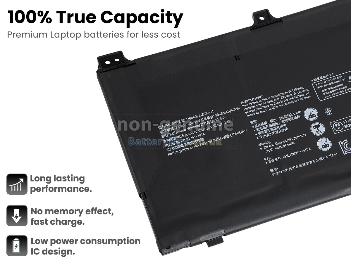 BatteryBuy.co.uk is your best choice of high quality Huawei laptop batteries! The brand new 42Wh(3 cells) replacement Huawei MATEBOOK D15 (2020) Li-ion battery is made with superior quality cells from Samsung, Panasonic and LG to ensure the best performance. Huawei MATEBOOK D15 (2020) battery case is made of non-flammable and durable plastic, which is fire-retarded and non-perishable when dropped from low heights.