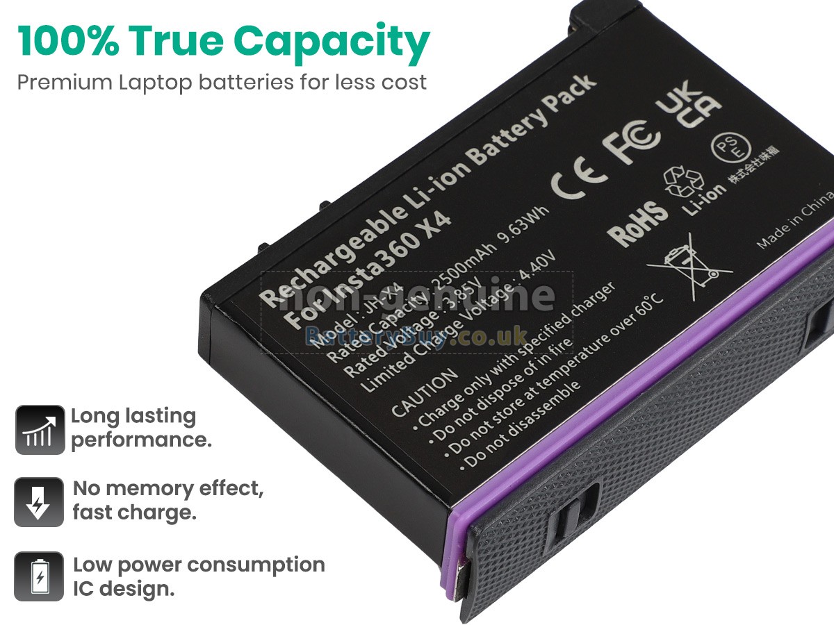 BatteryBuy.co.uk is your best choice of high quality Insta360 batteries! The brand new 2500mAh(2 cells) replacement Insta360 X4 Li-ion battery is made with superior quality cells from Samsung, Panasonic and LG to ensure the best performance. Insta360 X4 battery case is made of non-flammable and durable plastic, which is fire-retarded and non-perishable when dropped from low heights.