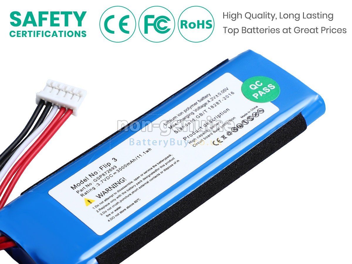 We are very strict with the safety requirements. Every our high-grade replacement battery for JBL FLIP 3 PORTABLE SPEAKER speaker has been tested to prove that they can match or surpass original JBL battery performance and be 100% compatible with Original Manufacturer Specifications. In compliance with international standards, they have obtained a series of rigorous safety certifications such as CE, UL, ROHS, ISO9001/9002. In general, this replacement JBL FLIP 3 PORTABLE SPEAKER battery can be charged/discharged up to more than 600 cycles.