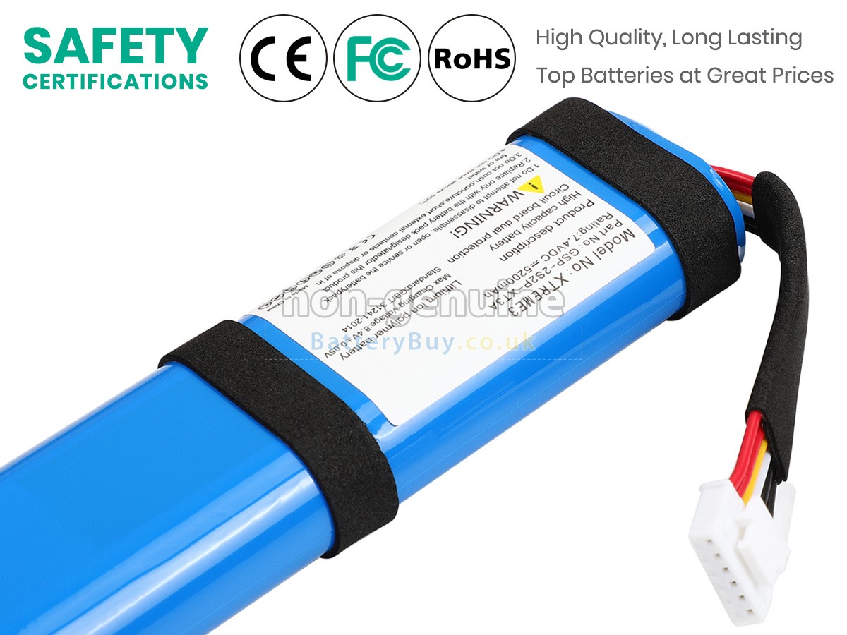 BatteryBuy.co.uk is your best choice of high quality JBL batteries for speakers! The brand new 38.5Wh(4 cells) replacement JBL XTREME 3 Li-ion battery is made with superior quality cells from Samsung, Panasonic and LG to ensure the best performance. JBL XTREME 3 battery case is made of non-flammable and durable plastic, which is fire-retarded and non-perishable when dropped from low heights.