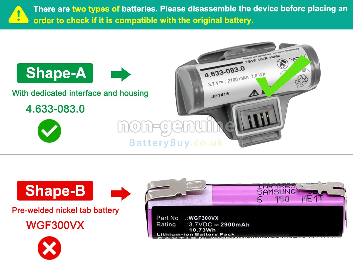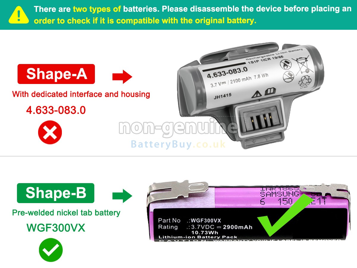 A: First, find out your old battery part number (e.g. 'Karcher WV2 PLUS') or the model name of vacuum cleaner and then match with our product compatibility table. Second, please compare your old battery with our product images to make sure their shapes are the same. Lastly, check the voltage (rating) is the same as the old one. For more details please click How to find one correct battery for my Vacuum Cleaners?