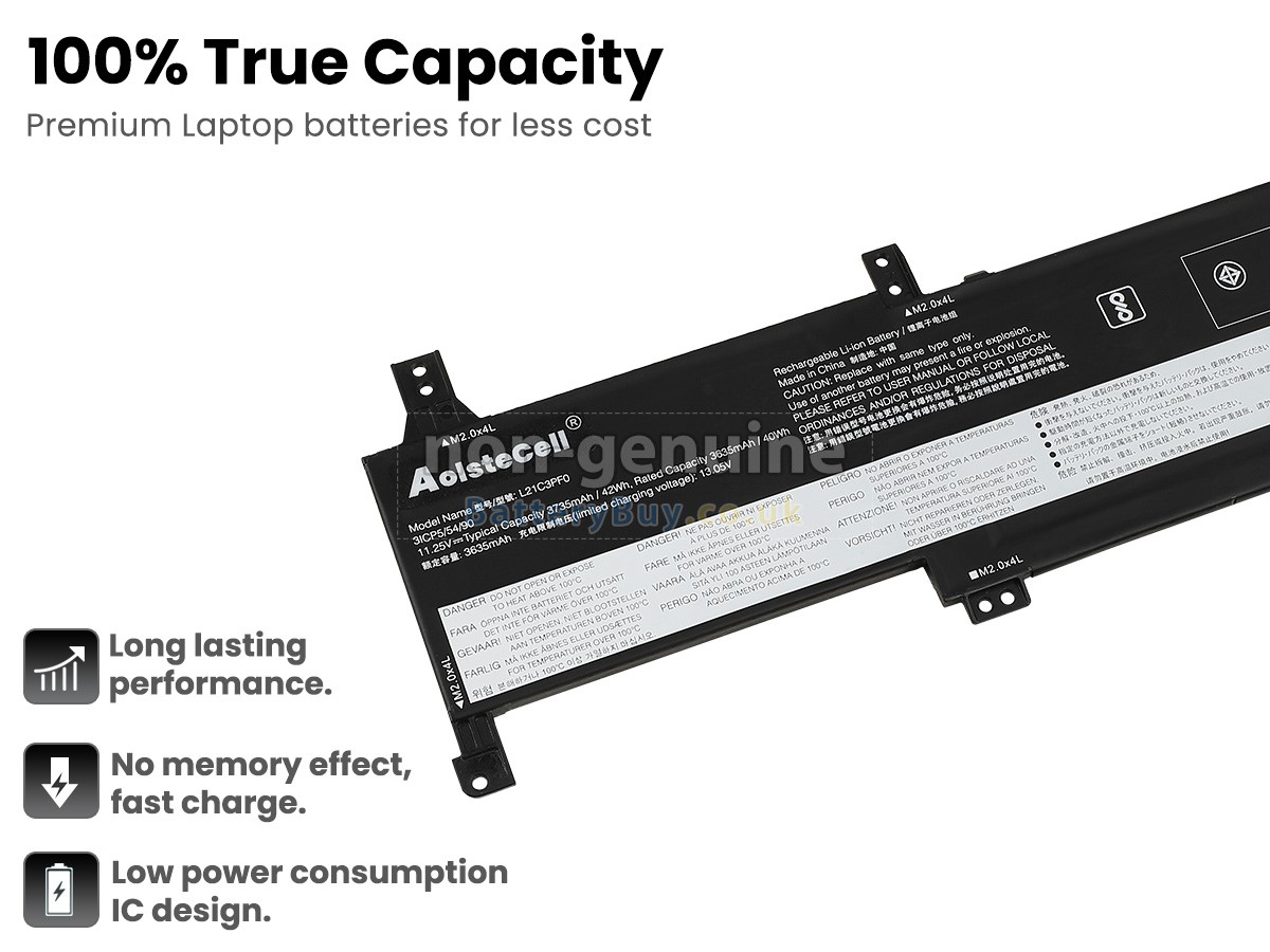 BatteryBuy.co.uk is your best choice of high quality Lenovo laptop batteries! The brand new 42Wh(3 cells) replacement Lenovo IdeaPad 1 15AMN7-82VG00B8LT Li-Polymer battery is made with superior quality cells from Samsung, Panasonic and LG to ensure the best performance. Lenovo IdeaPad 1 15AMN7-82VG00B8LT battery case is made of non-flammable and durable plastic, which is fire-retarded and non-perishable when dropped from low heights.