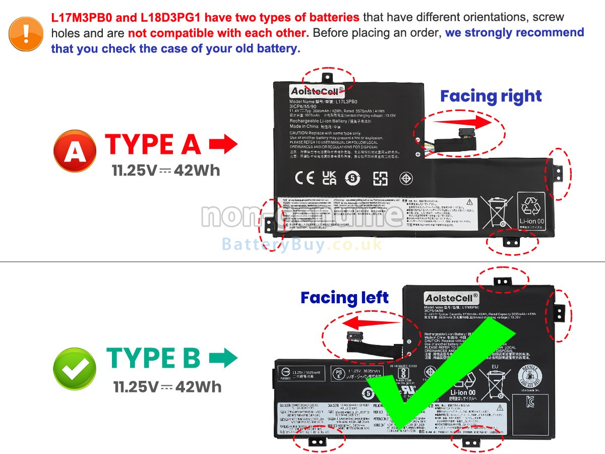 A: First, find out your old battery part number (e.g. 'Lenovo IdeaPad 3 CB-14IGL05-82C10030CF') or the model name of laptop and then match with our product compatibility table. Second, please compare your old battery with our product images to make sure their shapes are the same. Lastly, check the voltage (rating) is the same as the old one. For more details please click How to find one correct battery for my laptop?
