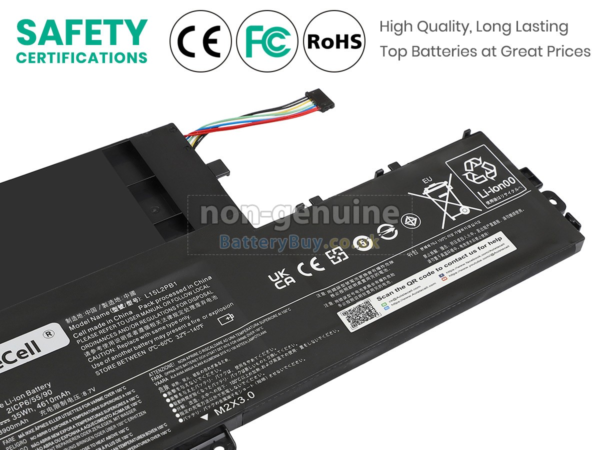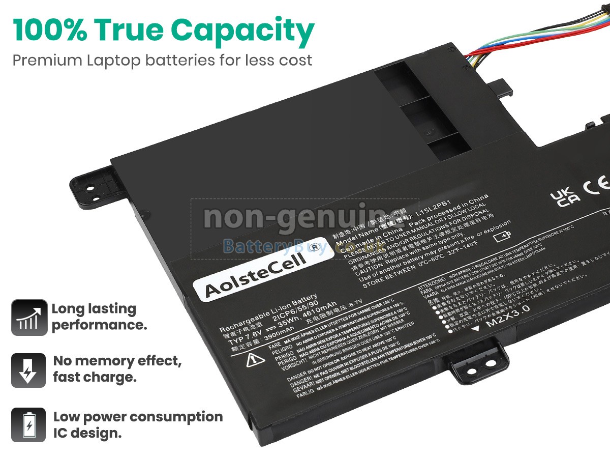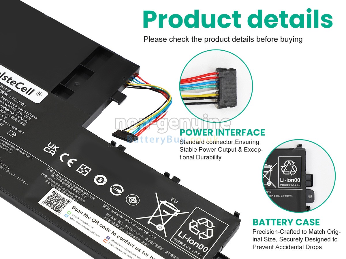 BatteryBuy.co.uk is your best choice of high quality Lenovo laptop batteries! The brand new 35Wh(2 cells) replacement Lenovo L15L2PB1(2ICP6/55/90) Li-Polymer battery is made with superior quality cells from Samsung, Panasonic and LG to ensure the best performance. Lenovo L15L2PB1(2ICP6/55/90) battery case is made of non-flammable and durable plastic, which is fire-retarded and non-perishable when dropped from low heights.