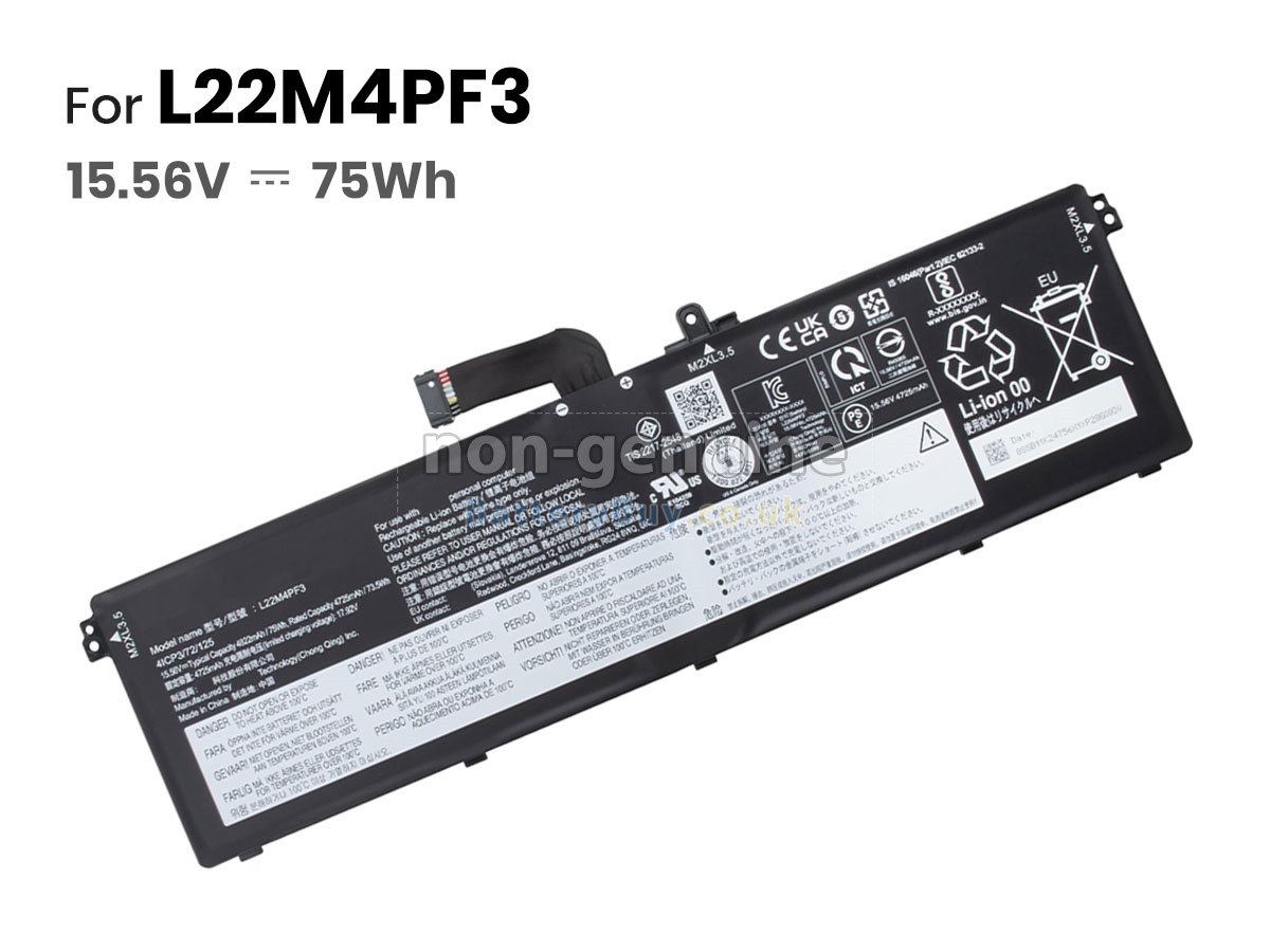 BatteryBuy.co.uk is your best choice of high quality Lenovo laptop batteries! The brand new 75Wh(4 cells) replacement Lenovo L22M4PF3 Li-Polymer battery is made with superior quality cells from Samsung, Panasonic and LG to ensure the best performance. Lenovo L22M4PF3 battery case is made of non-flammable and durable plastic, which is fire-retarded and non-perishable when dropped from low heights.