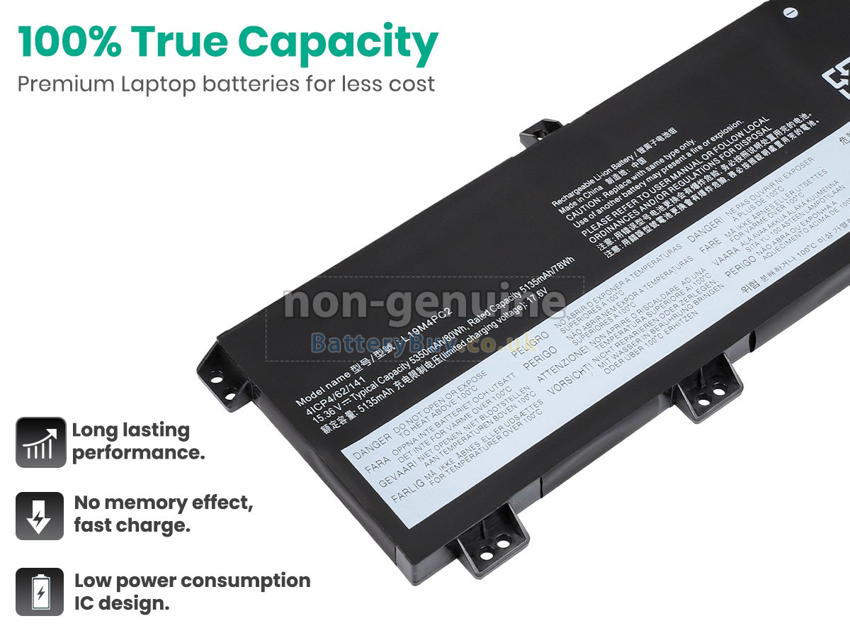 BatteryBuy.co.uk is your best choice of high quality Lenovo laptop batteries! The brand new 80Wh(4 cells) replacement Lenovo LEGION 5-15ARH05-82B5005CAU Li-Polymer battery is made with superior quality cells from Samsung, Panasonic and LG to ensure the best performance. Lenovo LEGION 5-15ARH05-82B5005CAU battery case is made of non-flammable and durable plastic, which is fire-retarded and non-perishable when dropped from low heights.