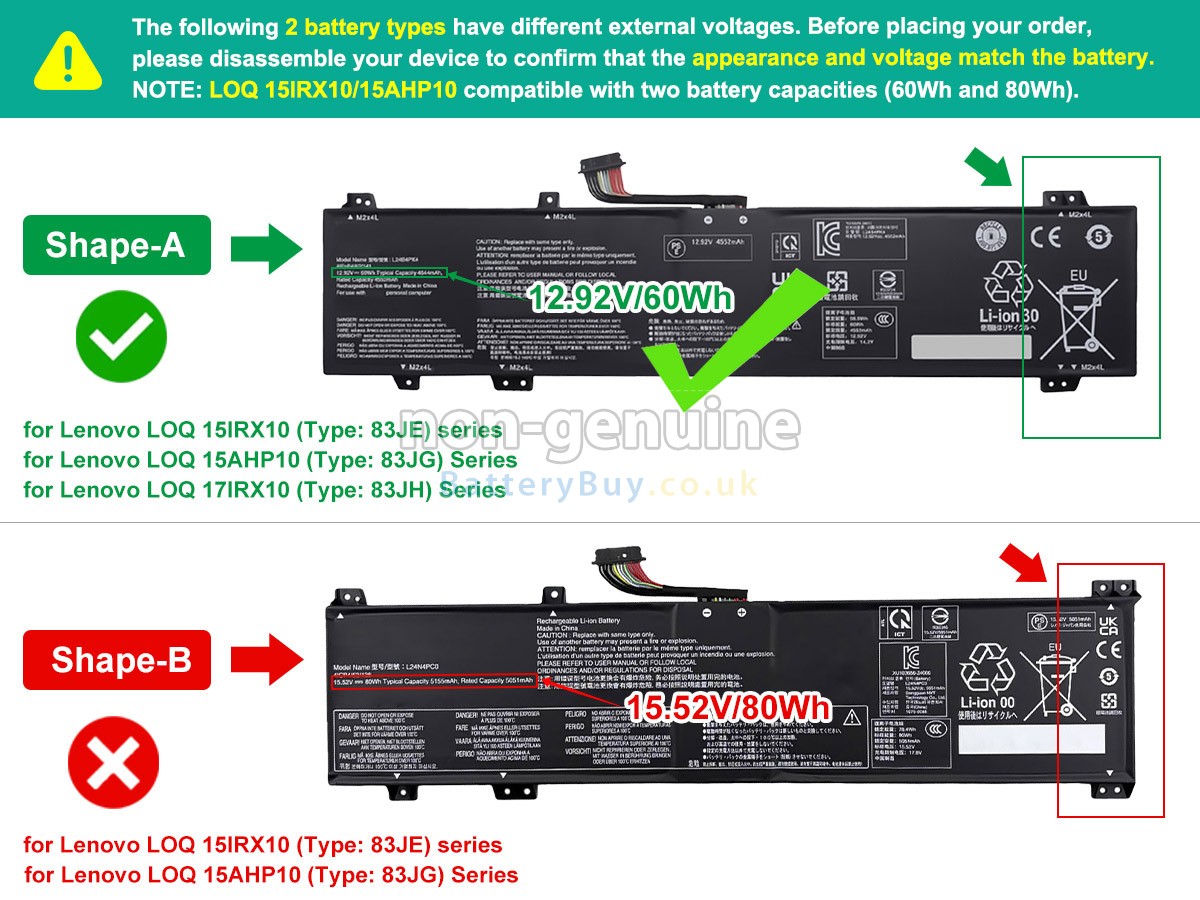 A: First, find out your old battery part number (e.g. 'Lenovo LOQ 15IRX10-83JE0136ID') or the model name of laptop and then match with our product compatibility table. Second, please compare your old battery with our product images to make sure their shapes are the same. Lastly, check the voltage (rating) is the same as the old one. For more details please click How to find one correct battery for my laptop?