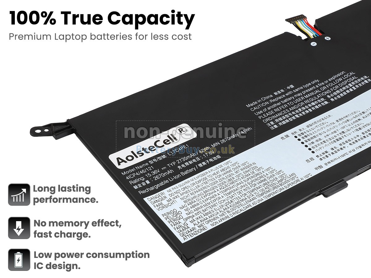 BatteryBuy.co.uk is your best choice of high quality Lenovo laptop batteries! The brand new 42Wh(4 cells) replacement Lenovo YOGA S730-13IML-81U4004QIV Li-Polymer battery is made with superior quality cells from Samsung, Panasonic and LG to ensure the best performance. Lenovo YOGA S730-13IML-81U4004QIV battery case is made of non-flammable and durable plastic, which is fire-retarded and non-perishable when dropped from low heights.