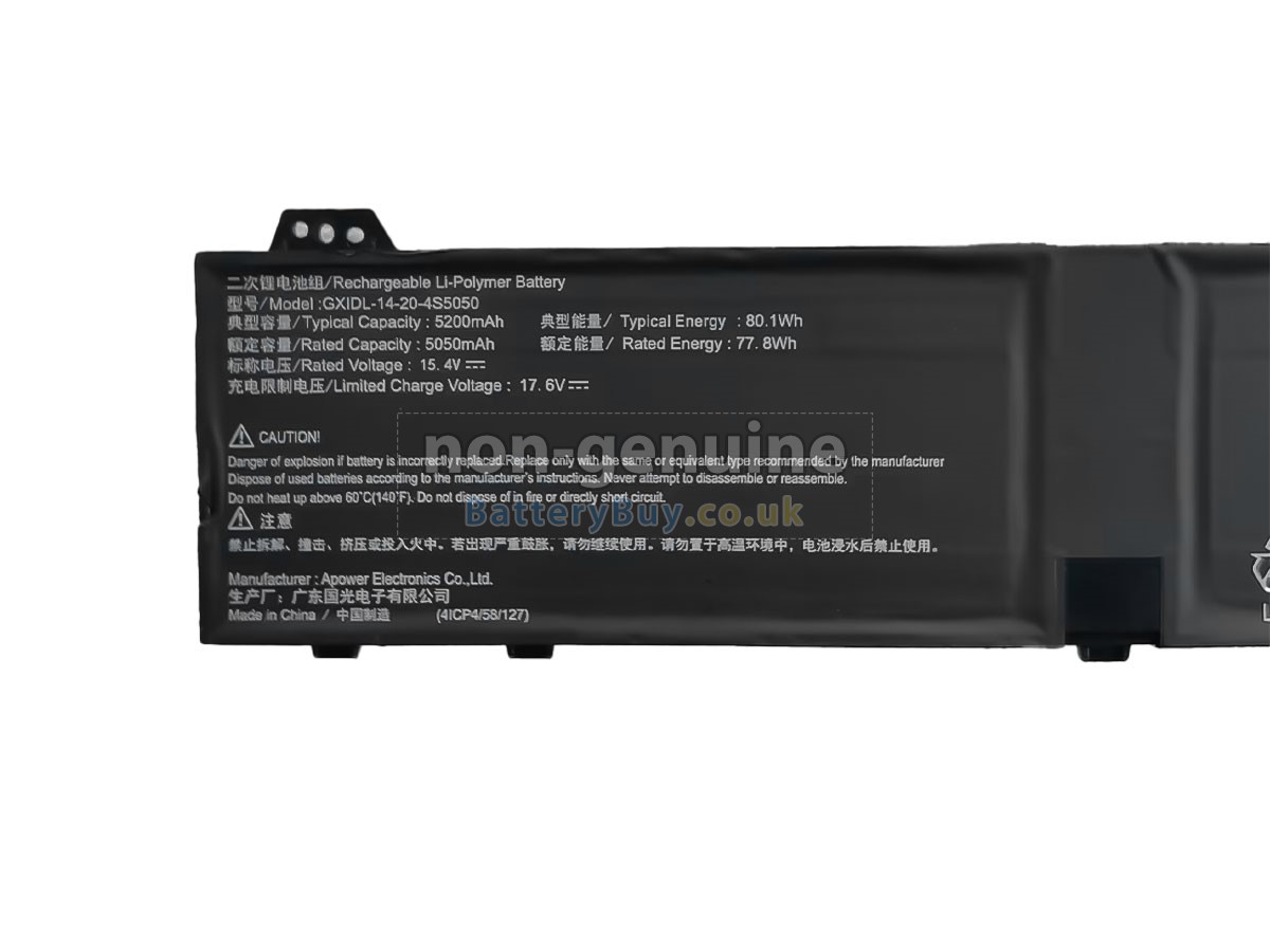 BatteryBuy.co.uk is your best choice of high quality Mechrevo laptop batteries! The brand new 80.1Wh(4 cells) replacement Mechrevo GXIDL-14-20-4S5050 Li-Polymer battery is made with superior quality cells from Samsung, Panasonic and LG to ensure the best performance. Mechrevo GXIDL-14-20-4S5050 battery case is made of non-flammable and durable plastic, which is fire-retarded and non-perishable when dropped from low heights.