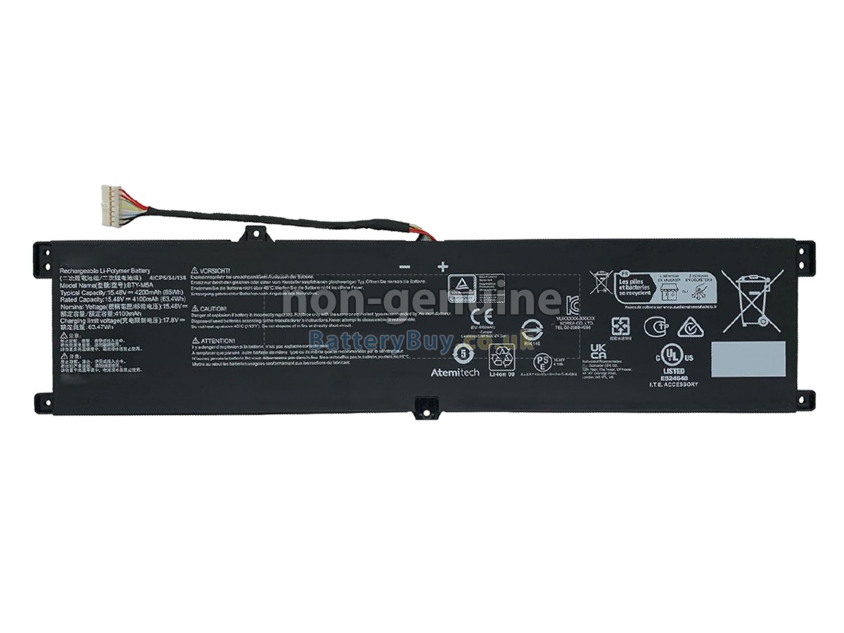 BatteryBuy.co.uk is your best choice of high quality MSI laptop batteries! The brand new 65Wh(4 cells) replacement MSI CREATOR M16 HX C14VGG-225AU Li-Polymer battery is made with superior quality cells from Samsung, Panasonic and LG to ensure the best performance. MSI CREATOR M16 HX C14VGG-225AU battery case is made of non-flammable and durable plastic, which is fire-retarded and non-perishable when dropped from low heights.
