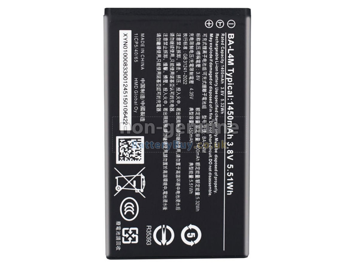 BatteryBuy.co.uk is your best choice of high quality Nokia batteries! The brand new 5.51Wh(1 cells) replacement Nokia BA-L4M Li-ion battery is made with superior quality cells from Samsung, Panasonic and LG to ensure the best performance. Nokia BA-L4M battery case is made of non-flammable and durable plastic, which is fire-retarded and non-perishable when dropped from low heights.