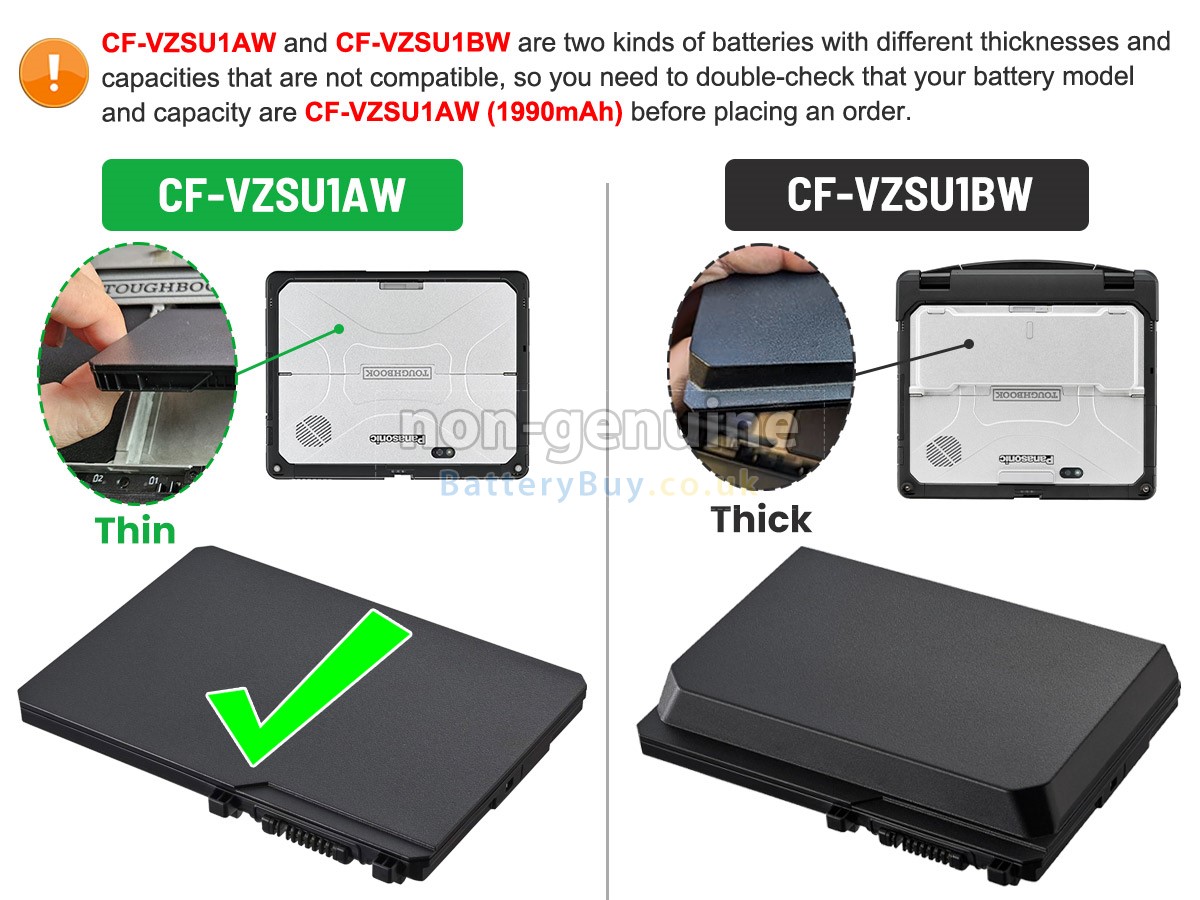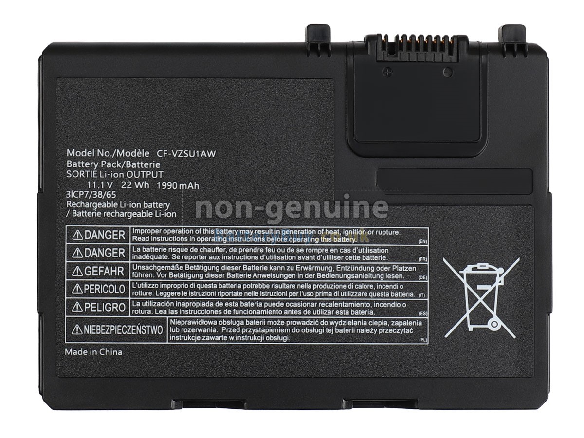 BatteryBuy.co.uk is your best choice of high quality Panasonic laptop batteries! The brand new 22Wh(3 cells) replacement Panasonic CF-VZSU1AW Li-ion battery is made with superior quality cells from Samsung, Panasonic and LG to ensure the best performance. Panasonic CF-VZSU1AW battery case is made of non-flammable and durable plastic, which is fire-retarded and non-perishable when dropped from low heights.