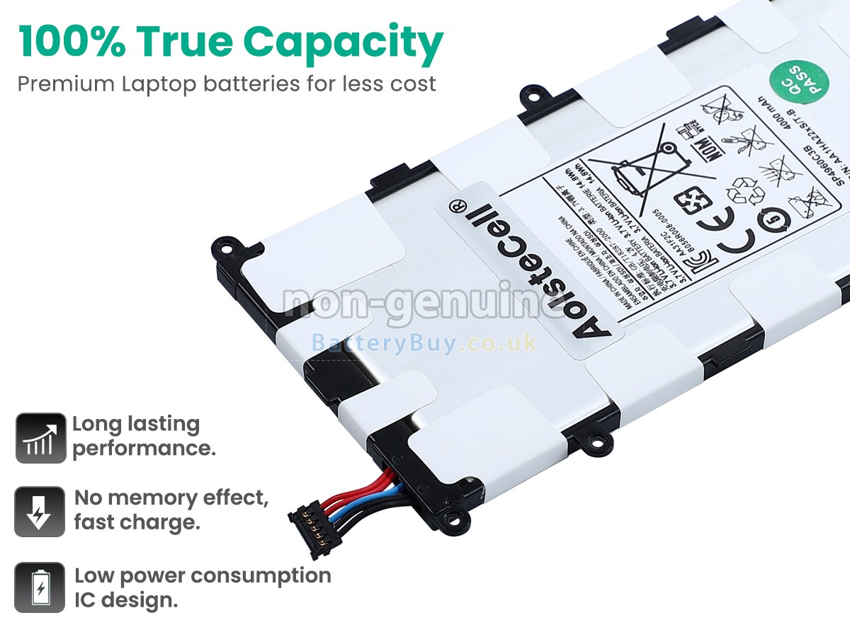 BatteryBuy.co.uk is your best choice of high quality Samsung laptop batteries! The brand new 4000mAh(2 cells) replacement Samsung Galaxy TAB 2 7.0 PLUS Li-Polymer battery is made with superior quality cells from Samsung, Panasonic and LG to ensure the best performance. Samsung Galaxy TAB 2 7.0 PLUS battery case is made of non-flammable and durable plastic, which is fire-retarded and non-perishable when dropped from low heights.