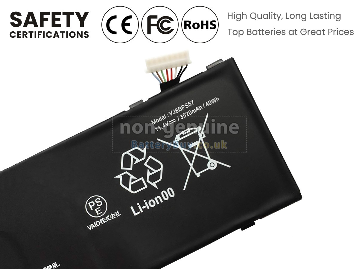 We are very strict with the safety requirements. Every our high-grade replacement battery for Sony VJ8BPS57 laptop has been tested to prove that they can match or surpass original Sony battery performance and be 100% compatible with Original Manufacturer Specifications. In compliance with international standards, they have obtained a series of rigorous safety certifications such as CE, UL, ROHS, ISO9001/9002. In general, this replacement Sony VJ8BPS57 battery can be charged/discharged up to more than 600 cycles.