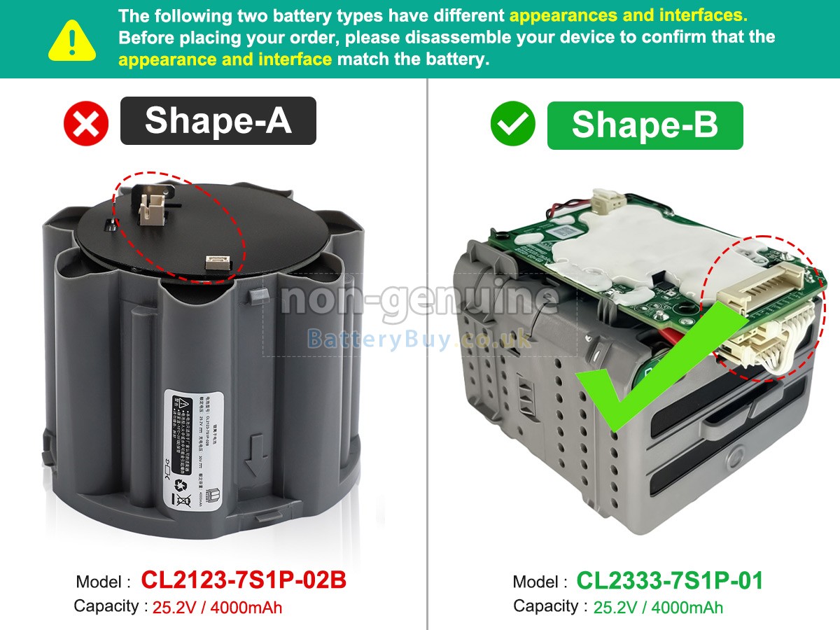A: First, find out your old battery part number (e.g. 'Tineco FW28030ECN') or the model name of vacuum cleaner and then match with our product compatibility table. Second, please compare your old battery with our product images to make sure their shapes are the same. Lastly, check the voltage (rating) is the same as the old one. For more details please click How to find one correct battery for my Vacuum Cleaners?