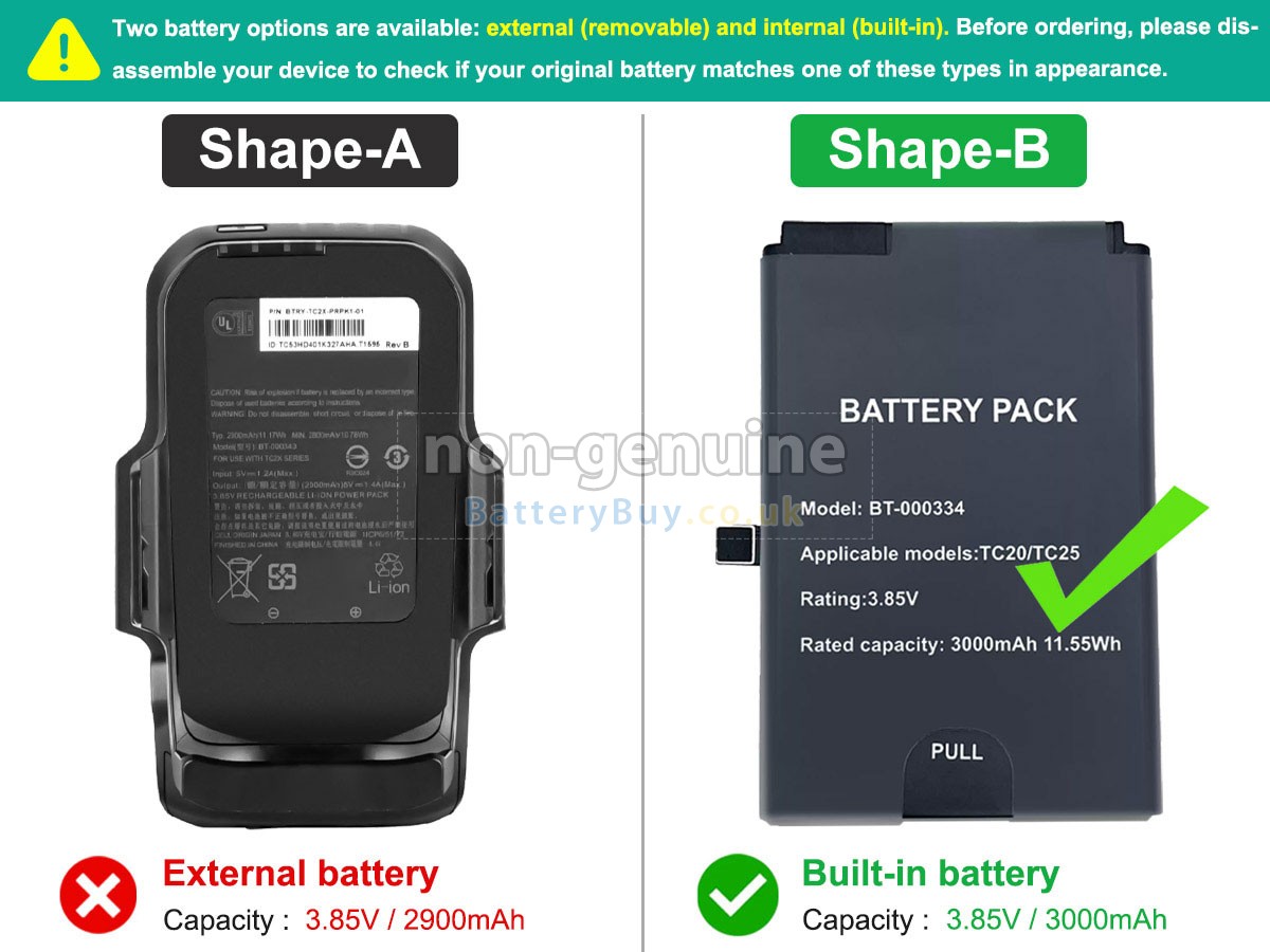A: First, find out your old battery part number (e.g. 'Zebra BTRY-TC2X-PRPK1-01') or the model name and then match with our product compatibility table. Second, please compare your old battery with our product images to make sure their shapes are the same. Lastly, check the voltage (rating) is the same as the old one.